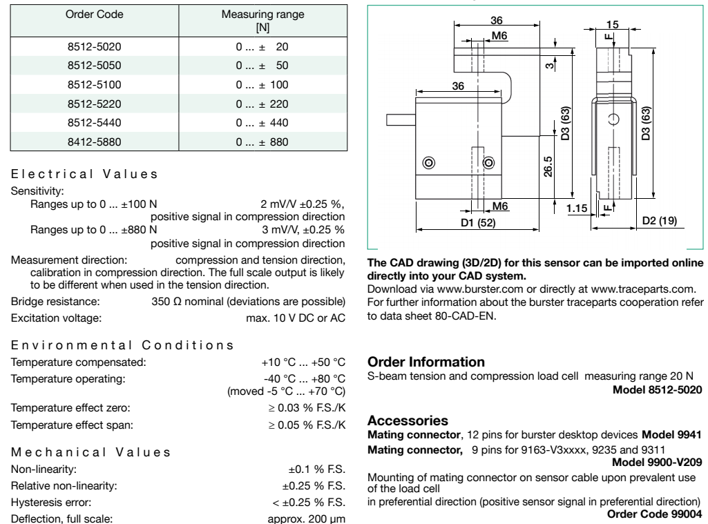 xuE廣州南創(chuàng)電子科技有限公司Model 8402: 8402-6001:0-1 kN ;8402-6002:0-2 kN ;8402-6005:0-5 kN ;8402-6010:0-10kN;8402-6020:0-20kN;8402-6050:0-50kN ;8402-6100:0-100kN;Model 8415: 8415-5200:0-200N 2.0kHz(諧振頻率);8415-5500:0-500N 4.0kHz(諧振頻率);8415-6001:0-1000N 6.5kHz(諧振頻率);8415-6002:0-2000N 10.5kHz(諧振頻率);8415-6005:0-5000N 20.0kHz(諧振頻率);Model 8416: 8416-5100:0-100N 6kHz(頻率);8416-5200:0-200N 20kHz(頻率);8416-5500:0-500N 18kHz(頻率);8416-6001:0-1000N 30kHz(頻率);8416-6002:0-2000N 45kHz(頻率);8416-6005:0-5000N 80kHz(頻率);Model 8417: 8417-5500:0-500N ;8417-6001:0-1000N ;8417-6002:0-2000N ;8417-6005:0-5000N;Model 8431: 8431-5:0-5N 0.5kHz(諧振頻率);8431-10:0-10N 1.8kHz(諧振頻率);8431-20:0-20N 2.0kHz(諧振頻率);8431-50:0-50N 5.7kHz(諧振頻率);8431-100:0-100N 6.5kHz(諧振頻率);8431-200:0-200N 13.8kHz(諧振頻率);8431-500:0-500N 20.5kHz(諧振頻率);8431-1000:0-1kN 21.0kHz(諧振頻率);8431-2000:0-2kN 23.9kHz(諧振頻率);8431-5000:0-5kN 50.0kHz(諧振頻率);8431-10000:0-10kN ;8431-20000:0-20kN ;8431-40000:0-40kN;Model 8432: 8432-2.5:0-2.5N 0.1kHz(諧振頻率);(過載保護(hù)) 8432-5: 0-5N 0.5kHz(諧振頻率);8432-10: 0-10N 1.8kHz(諧振頻率);8432-20: 0-20N 2.0kHz(諧振頻率);8432-50: 0-50N 5.7kHz(諧振頻率);8432-100:0-100N 6.5kHz(諧振頻率);8432-200:0-200N 13.8kHz(諧振頻率);8432-500:0-500N 20.5kHz(諧振頻率);8432-1000:0-1kN 21.0kHz(諧振頻率);8432-2000:0-2kN 23.9kHz(諧振頻率);Model 8435: 8435-5200:0-200N 5,0kHz(頻率);8435-5500:0-500N 9,0kHz(頻率);8435-6001:0-1000N 14,0kHz(頻率);8435-6002:0-2000N 18,0kHz(頻率);8435-6005:0-5000N 22,0kHz(頻率);Model 8438: 8438-5005:0-5N;8438-5010:0-10N;8438-5020:0-10N;8438-5050:0-50N;8438-5100:0-100N;8438-5200:0-200N;8438-5500:0-500N;8438-6001:0-1kN;8438-6002:0-2kN;8438-6005:0-5kN;8438-6010:0-10kN;8438-6020:0-20kN;8438-6050:0-50kN;8438-6100:0-100kN;8438-6200:0-200kN;Model 8451: 8451-5500:0-0.5kN ;8451-6001:0-1kN ;8451-6002:0-2kN ;8451-6005:0-5kN ;8451-6010:0-10kN ;8451-6020:0-20kN;3.Load Cells in various designs;Model 8510: 8510-5001:0-1N 5N(Overload protection) ;8510-5002:0-2N 10N(Overload protection) ;8510-5005:0-5N 15N(Overload protection) ;8510-5010:0-10N 20N(Overload protection) ;8510-5020:0-20N 40N(Overload protection);Model 8511: 8511-5005:0-±5N ;8511-5010:0-±10N ;8511-5020:0-±20N ;8511-5050:0-±50N ;8511-5100:0-±100N ;8511-5200:0-±200N ;8511-5500:0-±500N ;8511-6001:0-±1000N ;8511-6002:0-±2000N;Model 8523: 8523-20:0-20N;8523-50:0-50N;8523-100:0-100N;8523-200:0-200N;8523-500:0-500N;Model 8531: 8531-1000:0-1000N;8531-2000:0-2000N;8531-5000:0-5000N;Model 8524: 8524-5500:0-±0.5kN ;8524-6001:0-±1kN ;8524-6002:0-±2kN ;8524-6005:0-±5kN ;8524-6010:0-±10kN ;8524-6020:0-±20kN ;8524-6050:0-±50kN ;8524-6100:0-±100kN ;8524-6200:0-±200kN;Model 8526: 8526-5100:0-100N ;8526-5200:0-200N ;8526-5500:0-500N;8526-6001:0-1kN ;8526-6002:0-2kN ;8526-6005:0-5kN ;8526-6010:0-10kN ;8526-6020:0-20kN ;8526-6050:0-50kN ;8526-6100:0-100kN ;8526-6200:0-200kN;Model 8527: 8527-5500:0-500N ;8527-6001:0-1kN ;8527-6002:0-2kN ;8527-6005:0-5kN ;8527-6010:0-10kN ;8527-6020:0-20kN ;8527-6050:0-50kN ;8527-6100:0-100kN;Model 86402: 86402-5006:0-±6Nm ;86402-5012:0-±12Nm ;86402-5025:0-±25Nm ;86402-5063:0-±63Nm ;86402-5160:0-±160Nm ;86402-5500:0-±500Nm ;86402-6001:0-±1000Nm