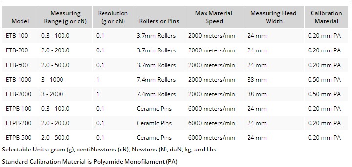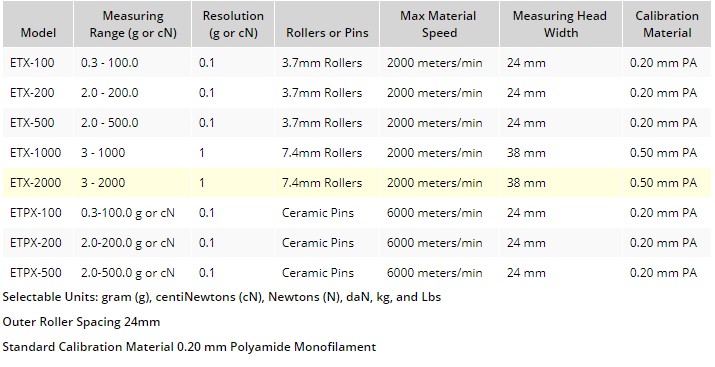Checkline ETX / ETPX數(shù)據(jù)記錄張力儀專為在各種應(yīng)用中精確測量細(xì)金屬絲,紗線和纖維上的張力而設(shè)計。滾子或陶瓷銷釘安裝在長的“指狀物”的末端,使用戶可以在有限的進(jìn)入空間內(nèi)或在幾條線緊緊排列時(例如在經(jīng)紗板上)測量張力。提供五(5)個測量范圍,最大容量為2000克或cN。1000 g和2000 g型號分別在短銷(手指)上安裝了直徑7.4mm的V型槽滾輪,而不是標(biāo)準(zhǔn)長度的銷(手指)和3.7 mm微型滾輪。