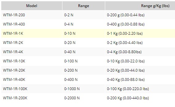 美國CHECKLINE_WTM-1R卷筒張力模塊所有量程型號(hào)如下:
