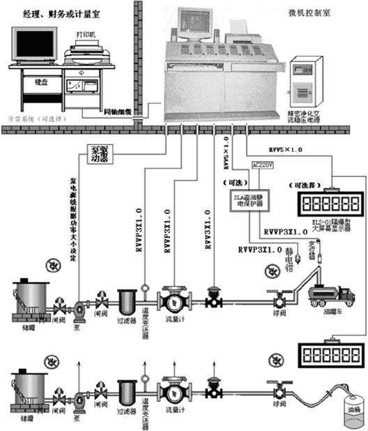 系統(tǒng)由主機(jī)(工業(yè)控制計(jì)算機(jī))、下位機(jī)(定值控制儀)、流量計(jì)、溫度變送器、輸料泵、電液(磁)閥和現(xiàn)場(chǎng)隔爆型大屏幕顯示器等主要部分構(gòu)成,其工作主要包括進(jìn)出物料的準(zhǔn)確定量發(fā)放、灌裝和各類物料的進(jìn)出數(shù)據(jù)管理,日、月、年進(jìn)出物料的歷史數(shù)據(jù)查詢,發(fā)料和進(jìn)料量各批次以及總量報(bào)表查詢,統(tǒng)計(jì)和打印。如果配備開票系統(tǒng),在營業(yè)室開票后,開票信息直接通過局域網(wǎng)進(jìn)入控制室計(jì)算機(jī),可以隨時(shí)進(jìn)行發(fā)放、灌裝,所有灌裝數(shù)據(jù)可通過進(jìn)入廠級(jí)計(jì)算機(jī)管理網(wǎng)絡(luò),實(shí)現(xiàn)動(dòng)態(tài)管理。