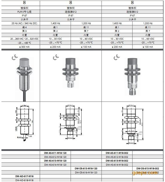 DW-AS-621-M8-001瑞士科瑞接近開(kāi)關(guān)包括Φ6.5mm到M30尺寸的所有常用的傳感器。根據(jù)IEC60947-5-2/EN60947-5-2以及VDE0660中的208節(jié),所有傳感器分別有3線直流,PNP和NPN,都接有電纜或連接器。M12,M18以及M30都有2線型號(hào)(10-30VDC或20-265VAC/20-320VDC)。