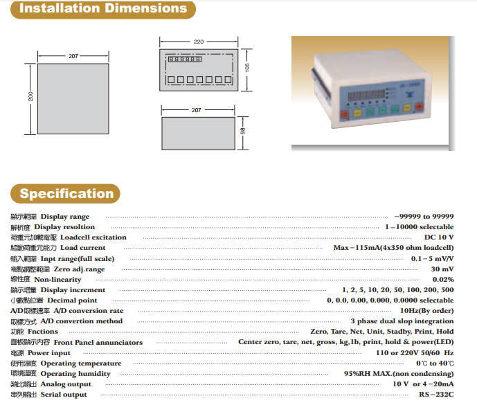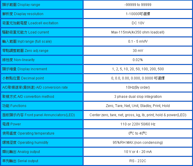 產(chǎn)品描述:臺(tái)灣JIHSENSE JS-2000_JS-2000顯示器系高功能高精度顯示器,本顯示器針對(duì)應(yīng)變規(guī)式感測(cè)器所設(shè)計(jì),有絕佳的穩(wěn)定性,類比信號(hào)可提供+/- 10V或4-20mA輸出,A-D採用最精確的雙斜率積分方式,每秒鐘取樣10次,本顯示器所有設(shè)定工作均由前面版的按鍵輸入,特別設(shè)計(jì)的總重修正功能,可讓使用者精確調(diào)整重量,使校正工作快速精確。