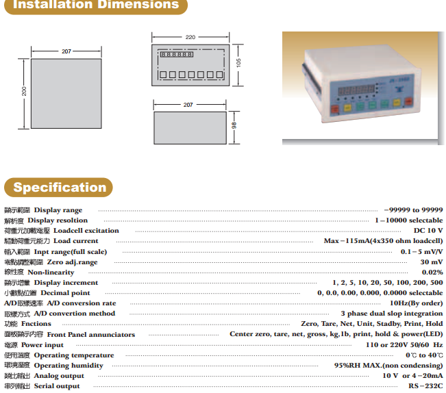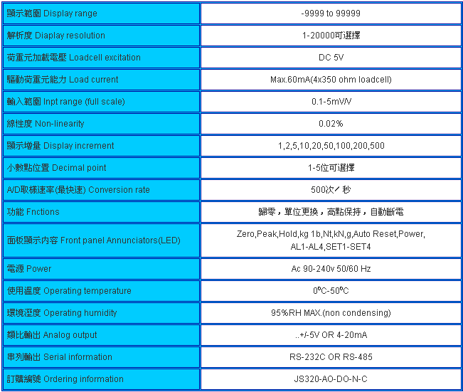 臺(tái)灣JIHSENSE JS-320_JS-320稱(chēng)重顯示控制器可標(biāo)配本品牌所有模擬荷重元規(guī)格: