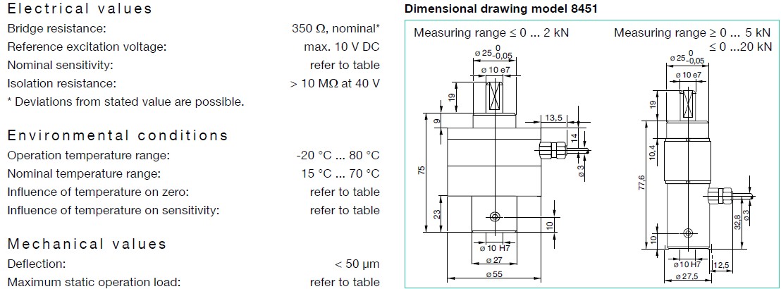 測力8451-6020傳感器測量柱塞和工具的圓形接觸表面之間的壓縮力。在其頂側(cè)和空穴在其下表面上的針都只是提供了機械固定和正確地定心的組件。為了提供盡可能大的范圍內(nèi)的機械相容性越好,銷/孔,可在不同的直徑。連接電纜的設計就像機器人電纜允許頻繁動作,并牢固地固定在傳感器外殼。附件是可用它夾在報刊感應器根據(jù)使用的情況下,可以輕松安裝8451-6020:0-20kN傳感器。