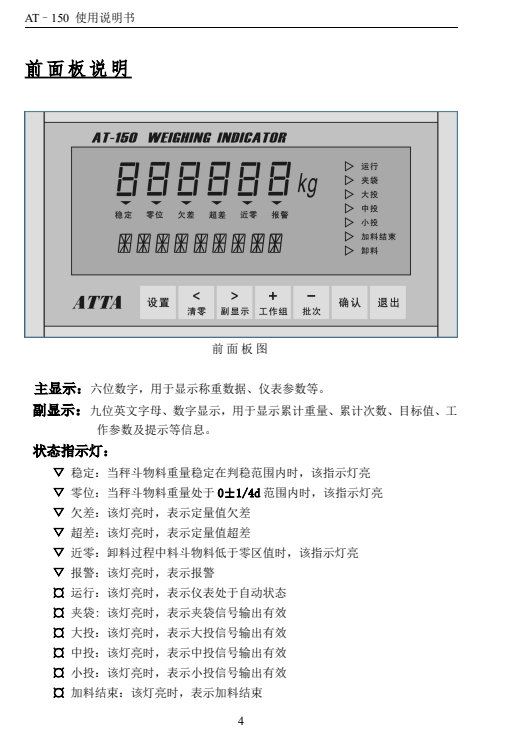 Z4A廣州南創(chuàng)電子科技有限公司AT-150B稱重控制器儀表技術(shù)亮點:Z4A廣州南創(chuàng)電子科技有限公司雙顯示屏設(shè)計:主副熒光顯示屏,主屏六位顯示稱重數(shù)據(jù),副屏九位顯示累計值、參數(shù)等。