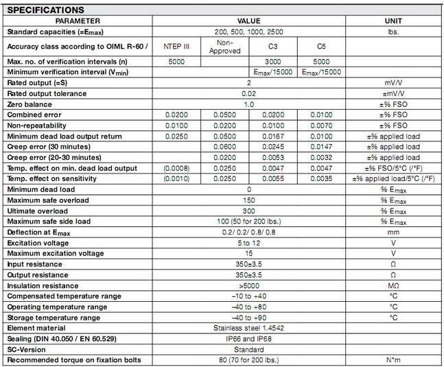 21469: Load Cell,SBM 363-B10-1.5 K-20P1 1,500 lb 20ft RTI 3mV/V 350 OHM WW NTEP IIIL 10 S FM