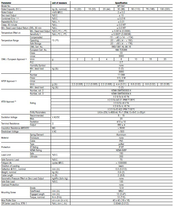 梅特勒托利多MT1041-100kg稱重傳感器技術(shù)指標: