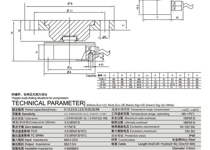 YBSC-A-50t稱重傳感器輸入阻抗1450 ±10Ω 負(fù)載阻抗: <500Ω