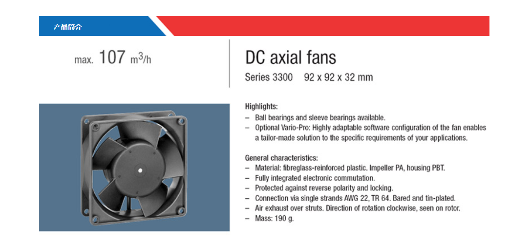 ebmpapst風(fēng)扇3314 24DC 2.4W可通過外置電路的脈寬調(diào)制(PWM)或電壓調(diào)節(jié)來調(diào)節(jié)風(fēng)機(jī)轉(zhuǎn)速,VARIOFAN:通過內(nèi)置或外置的溫度傳感器,風(fēng)機(jī)的運(yùn)行可隨著溫度的變化而變化。