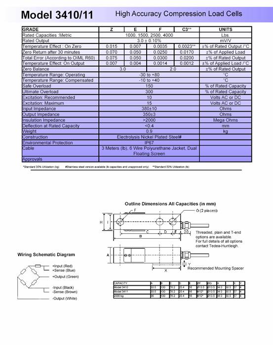 美國(guó)TEDEA-HUNTLEIGH 3410-4000LB稱重傳感器技術(shù)參數(shù)圖: