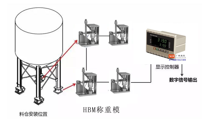 考慮到系統(tǒng)冗余,在100T料倉底部安裝4個40T容量的HBM稱重模塊,采用傳感器串聯(lián)法將信號送至顯示控制器,通過顯示控制器將信號輸出到指定的系統(tǒng)中。met廣州南創(chuàng)電子科技有限公司