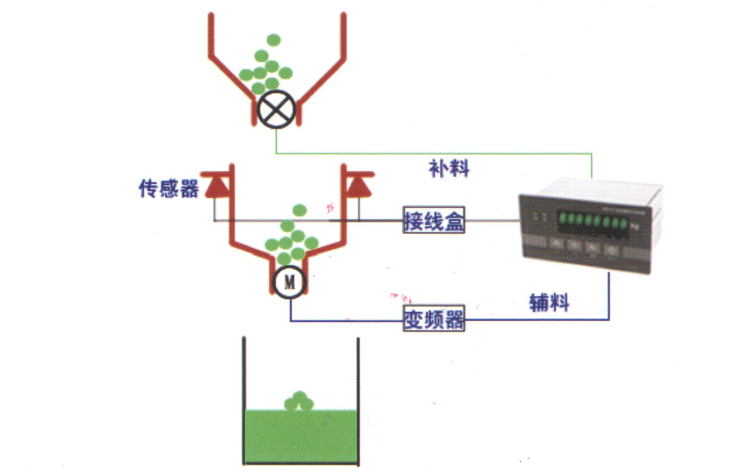 適合流動(dòng)性不好的物料,按實(shí)際排料量計(jì)量;秤斗不能太大,否則精度可能 不高;可在原有的儲(chǔ)料斗上直接改造;秤斗內(nèi)先裝滿物料,配料時(shí),控制器控制 卸料閥門打開,每次排出設(shè)定重量的物料;當(dāng)檢測(cè)到料斗內(nèi)剩佘物料達(dá)到下限 時(shí),啟動(dòng)輸送機(jī)結(jié)構(gòu)向料斗內(nèi)裝料,直接到上限值時(shí)停止。
