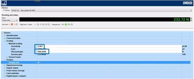 靈敏度可以在CMD Assistant軟件中設(shè)定。 在“傳感器靈敏度” 欄中設(shè)定。然后您可以定義 "物理輸入范圍"。這是個測量范圍,輸入你希望測量的最大力。如果以后有一個更大的力,CMD 不會提供電壓輸出。設(shè)定CMA. 按以上計算,靈敏度為 3.801 pC/N ,應(yīng)用的測量訪問為500 N. CMD 對應(yīng) 500 N 的輸出為 10 V。