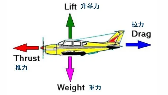 影響氣流的4個主要作用力:升舉力、重力、推力、拉力,這些作用力相互作用。