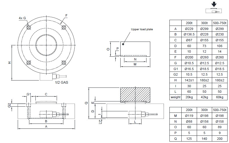 最大量程負(fù)載(E max):200000Kg、300000Kg、500000Kg、750000Kg