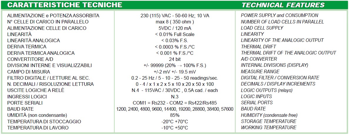 Indicatore di peso in custodia a norme DIN per montaggio a fronte quadro. Dimensioni: 72 x 144 x 170 mm (profondità d’incasso compresi cablaggi seriale e morsettiere). Dima di foratura 67 x 139 mm. Tastiera 5 tasti in policarbonato. Display semialfanumerico a 5 cifre da 20 mm, a 7 segmenti. Grado di protezione del frontale dello strumento IP 54.