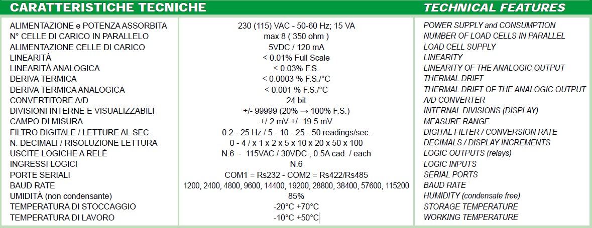 Indicatore di peso in custodia a norme DIN per montaggio a fronte quadro.Dimensioni: 72 x 144 x 170 mm (profondità d’incasso compresi cablaggi seriale e morsettiere). Foratura 67 x 139 mm. Display semialfanumerico a 8 cifre da 14 mm, a 7 segmenti. Tastiera a membrana a 16 tasti con buzzer. Grado di protezione del frontale IP54. Orologio calendario su scheda madre con batteria tampone.