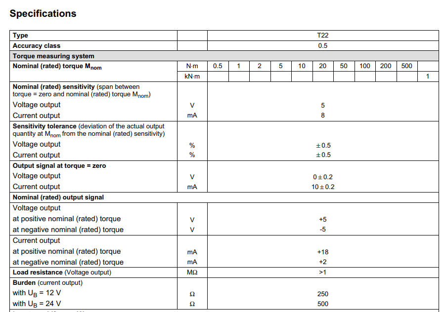德國HBM T22扭矩傳感器技術參數(shù):