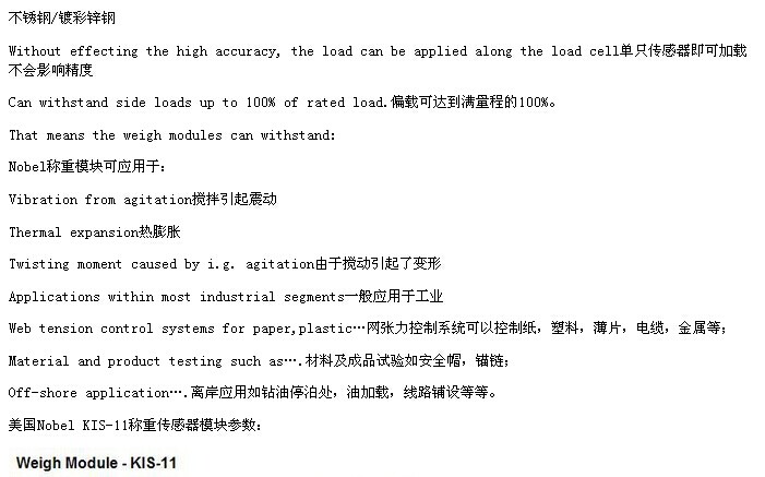 根據(jù)稱重模塊的受力特性的實(shí)際應(yīng)用,稱重模塊分為兩種類型;靜態(tài)模型和動(dòng)態(tài)稱重的稱量模塊。美國Vishay Nobel稱重模塊KIS-11靜態(tài)稱重只有垂直力應(yīng)用模塊,為反應(yīng)器,水箱,重量檢測(cè)儲(chǔ)料斗。動(dòng)態(tài)加載模塊,將力明顯的場(chǎng)合。如平臺(tái),重量檢測(cè),輸送帶生產(chǎn)線。