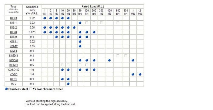 KIS-8: 1KN, 2KN, 5KN,10KN, 20KN, 50kn, 100kn, 200kn 精度0.075%;
