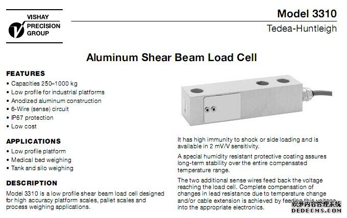 美國Tedea 3310稱重傳感器量程:3310-250kg、3310-500kg、3310-750kg、3310-1000kg。