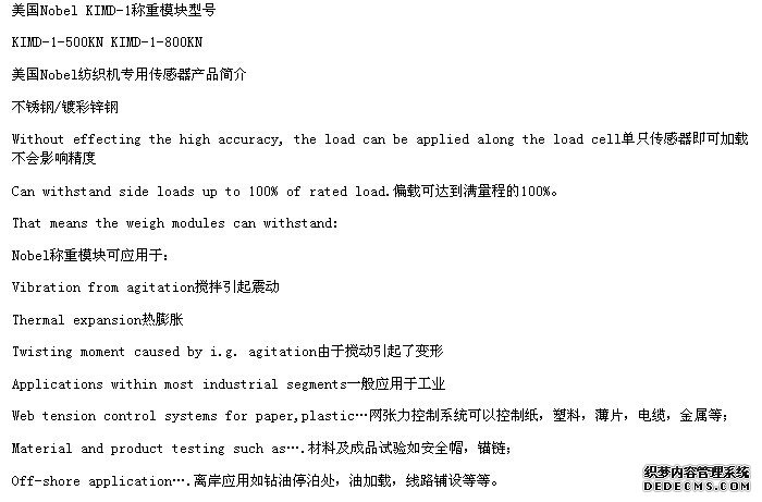 以上全部是關于美國Nobel稱重傳感器KIMD-M-500KN的相關介紹,如果您多NOBEL KIMD-M-500KN稱重模塊以及配套其他產(chǎn)品(稱重傳感器,接線盒,放大器)價格,尺寸,使用技術(shù)有需求可來電咨詢或者郵件咨詢!?。?