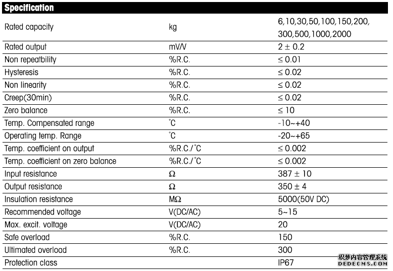 適用于干燥環(huán)境中,主要用于臺(tái)秤、包裝秤、皮帶秤、檢重秤和過(guò)程控制的場(chǎng)合。傳感器容量有6,10,30,50,100,150,200,300,500,1000,2000kg