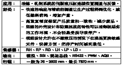 傳感器的外殼類型、磁鐵類別、接頭方式、電纜長(zhǎng)度、安裝方式等均由用戶或設(shè)計(jì)院決定,而輸出模式則應(yīng)根據(jù)用戶選用的控制器而定,這些選項(xiàng)不是MTS公司能決定的,但可以提供協(xié)助。 應(yīng)用范圍: MTS產(chǎn)品應(yīng)用十分廣泛,特別概括了一些成功應(yīng)用領(lǐng)域 測(cè)量范圍-動(dòng)作感應(yīng),直線性位移,弧度線性位移,速度 測(cè)量目的-位置測(cè)量,回授控制(閉環(huán)系統(tǒng)) 測(cè)量數(shù)據(jù)-絕對(duì)位置,速度,相對(duì)位置 應(yīng)用環(huán)境-所有需要高速,精確,長(zhǎng),短行程的作動(dòng)系統(tǒng),如液壓動(dòng)力,伺服位置與速度控制 目標(biāo)市場(chǎng)-工業(yè):工廠自動(dòng)化生產(chǎn)線,如鋼鐵廠,注塑與壓鑄,木材加工,水電廠和紙品加工 商業(yè):汽車,行走機(jī)械,飛機(jī),消費(fèi)電子,醫(yī)療設(shè)備,家用電氣等 專業(yè):特殊案子,如斜坡護(hù)土監(jiān)控及打撈俄羅斯庫(kù)爾斯克號(hào)潛艇 |