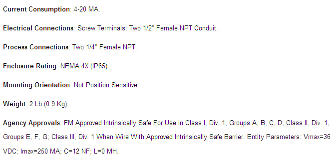 608系列微差壓變送器用于空氣或其它兼容氣體的壓力,差壓,負(fù)壓的測量,輸出標(biāo)準(zhǔn)的兩線制4-20 MA信號。它采用了超薄的硅膠隔膜,可測量低到0.1英寸水柱的量程范圍,并且同時可承受高靜壓到100 Psig (6.89 Bar)。608變送器帶有FM認(rèn)證的本安防爆證書,配合本安隔離柵可用于危險場合。它的不銹鋼的NEMA 4X防護(hù)的外殼最適合用于各種工業(yè)場合。